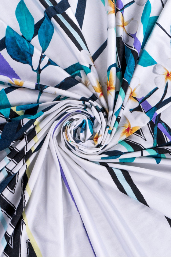 Італійське еластичне трикотажне полотно лайкра в купоні розмірами 135 см*140 см. Біле трикотажне полотно зі зростаючим, барвистим квітковим візерунком, низ купона оброблений декоративною облямівкою шириною 35 см. Тканина з щільним, гладким плетінням з охолоджуючим ефектом, дуже еластична - відмінно підійде для людей, яким подобається одяг, що облягає тіло, і оригінальні квіткові мотиви. Він ідеально підходить для пошиття повсякденного одягу, а також купальника або пляжної зони, оскільки він зручний і швидко сохне.