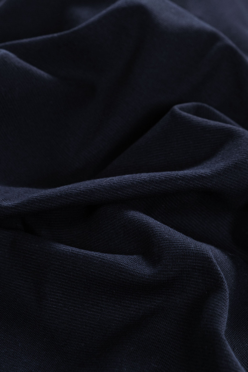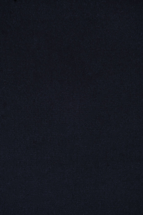 Італійська віскозна трикотажна тканина в рубчик темно-синього кольору. Тканина поставляється в «рукаві» шириною 45 см. Тканина з характерним, ребристим переплетенням - відмінно підійде для обробки толстовки або спортивних штанів.