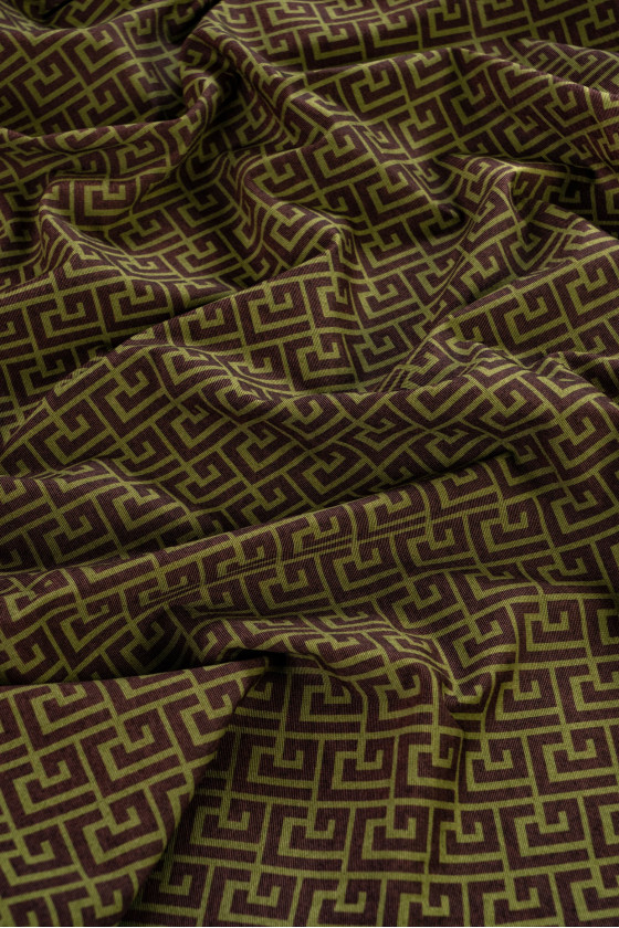 Італійський віскозний трикотажний полотно в оливково-коричневому кольорі - підписано логотипом відомого французького Будинку моди. Джерсі - це м'ясиста, непрозора, м'яко драпірується трикотажна тканина, яку можна шити без підкладки. Він чудово підійде для повсякденних суконь, спідниць, жакетів. Ми рекомендуємо провести попередню усадку перед пошиттям.