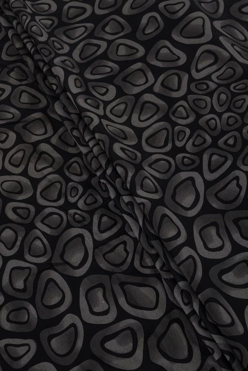 Італійський трикотаж ацетатне трикотажне полотно чорного кольору з мотивом сірого, геометричні візерунки, що нагадують клаптики розміром близько 6 см. Трикотажне полотно Джерсі - це непрозоре трикотажне полотно, що м'яко драпірується, яке можна шити без підкладки.