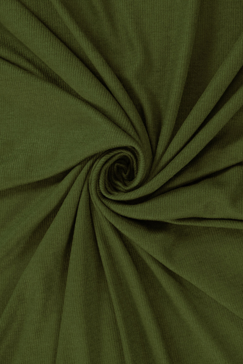 Італійське бавовняне трикотажне полотно оливково-зеленого кольору, шириною 110 см. Тканина з характерним, ребристим переплетенням, що нагадує рант - відмінно підійде для пошиття сукні або блузки.