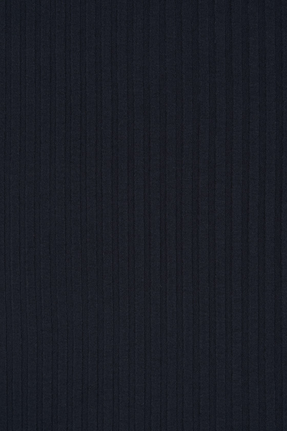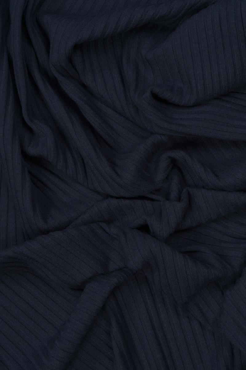 Італійське трикотажне полотно з широким переплетенням в рубчик (0,5 см) темно-синього кольору. М'яке, дуже еластичне, непрозоре, приємне на дотик трикотажне полотно - відмінно підійде для пошиття сукні, спідниці або блузки.