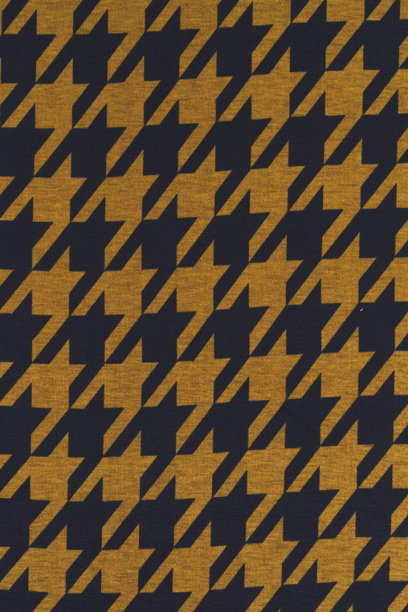 Італійське трикотажне полотно з великим мотивом курячої лапки (7 см) гірчичного та чорного кольорів. Трикотажне полотно Джерсі - це покривна тканина з щільним плетінням, еластична, м'яко драпірується, яку можна пришивати без підкладки. Він відмінно підходить для повсякденних суконь.