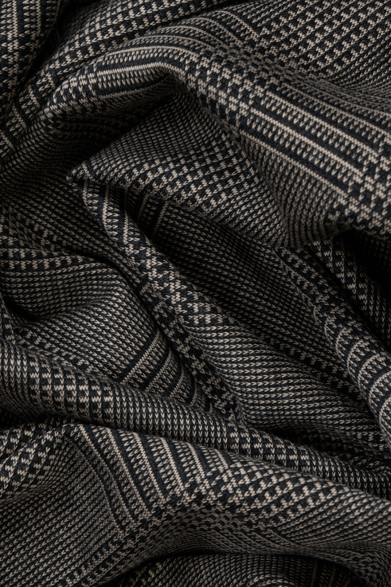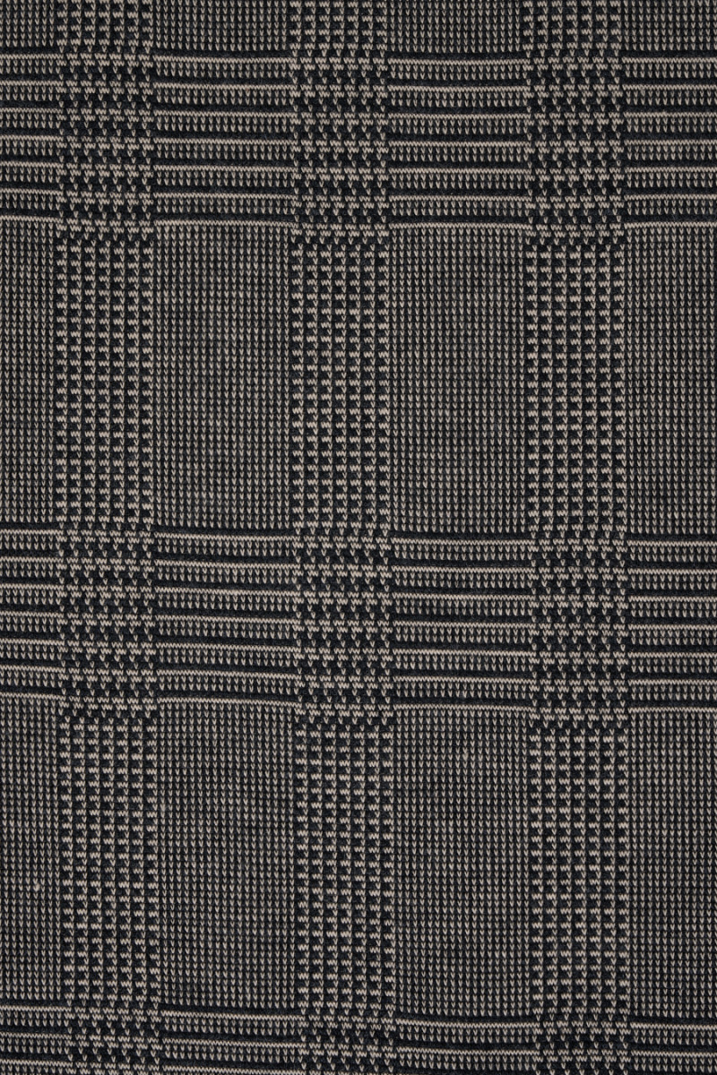Італійська трикотажна тканина з чорно-коричневим картатим мотивом розміром 4 см * 9 см. Тканина Джерсі - це покривне, м'яко складається, еластичне трикотажне полотно, яке можна шити без підкладки. Ідеальна пропозиція в класичному дизайні для створення сукні, спідниці, брюк і жакета.