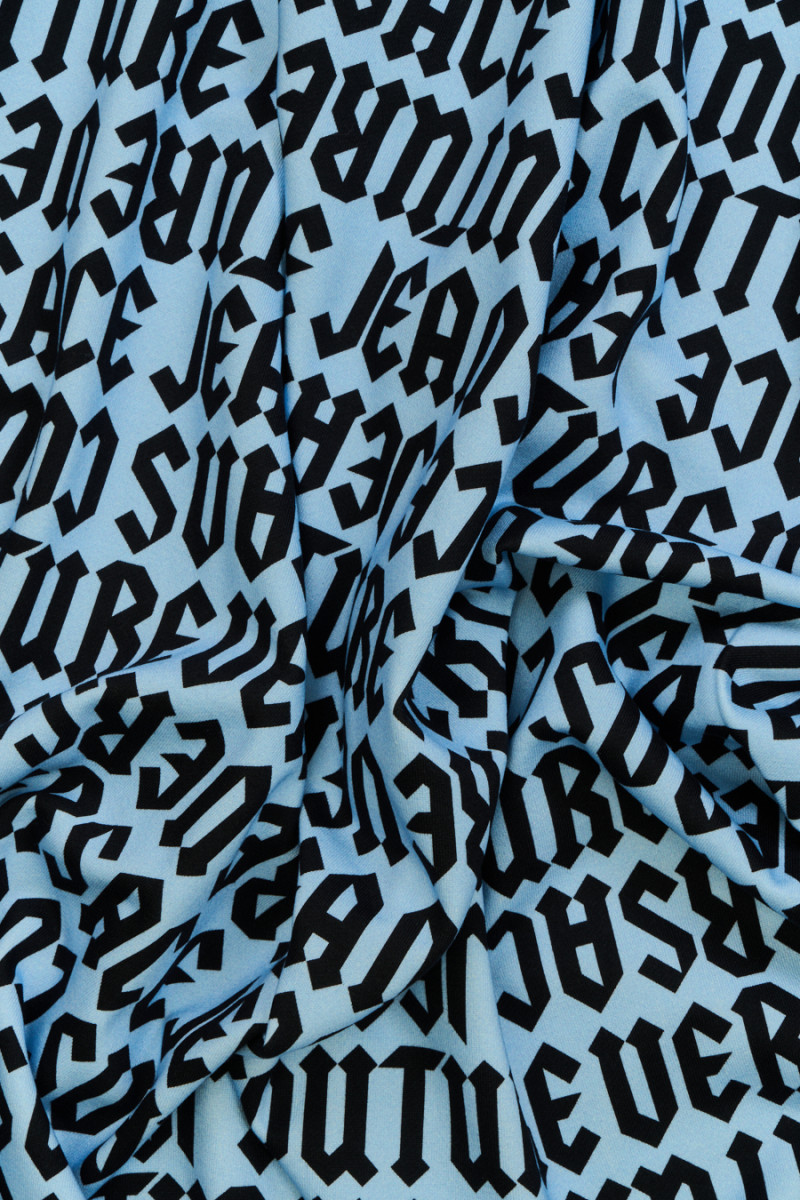 Італійська тканина світшот зі 100% бавовни з мотивом чорних написів на синьому тлі. Візерунок щільний і правильний, букви мають висоту 4 см. Трикотажне полотно тілесне, м'яке, еластичне, матове і ліва сторона оброблена пушком. Фантастична пропозиція для шанувальників підписаних тканин, ви можете використовувати його для пошиття штанів, світшотів, тунік.