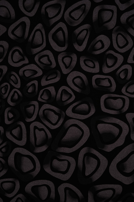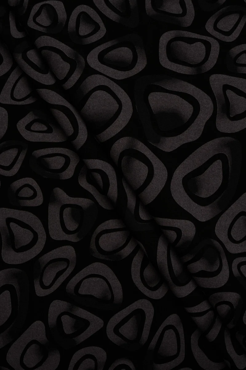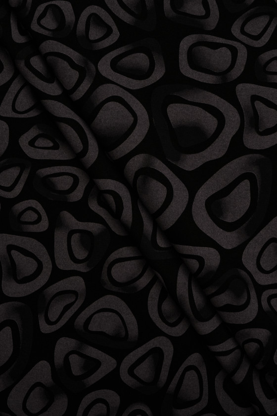 Італійський трикотаж трикотажне полотно чорного кольору з мотивом сірого, геометричні візерунки, що нагадують клаптики розміром близько 6 см. Трикотажне полотно Джерсі - це непрозоре трикотажне полотно, що м'яко драпірується, яке можна шити без підкладки. Він ідеально підходить для повсякденних суконь, спідниць, жакетів.