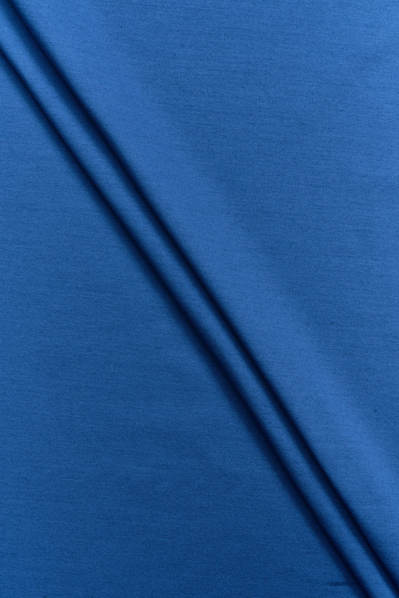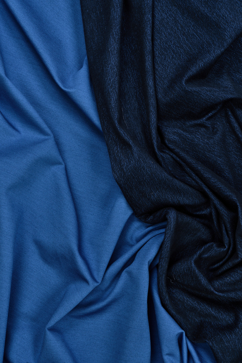 Італійська двостороння тканина світшота - одна сторона синього кольору, інша темно-синього меланжу. Матеріал непрозорий, еластичний, середньої товщини, може бути пришитий без підкладки. Він ідеально підходить для повсякденного одягу, такого як світшоти, куртки, сукні, штани.