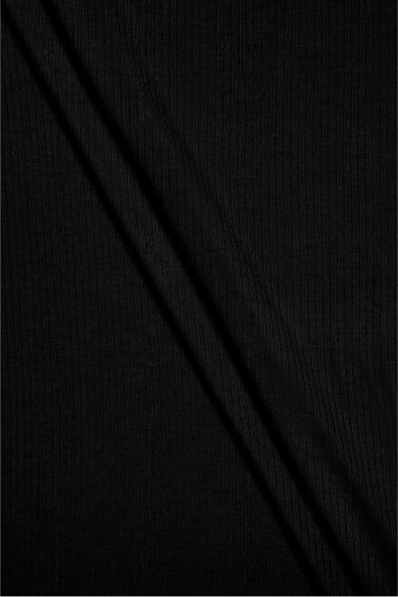 Італійське віскозне трикотажне полотно чорного кольору, виконане в ніжну, густу смужку. Ширина однієї смуги становить 3 мм, а простір між малюнком - 2 мм. Трикотажне полотно м'яке, матове, досить тонке, але непрозоре, гнучке і дуже приємне для захоплення. Він ідеально підходить для блуз, топів, приталених суконь та спідниць.