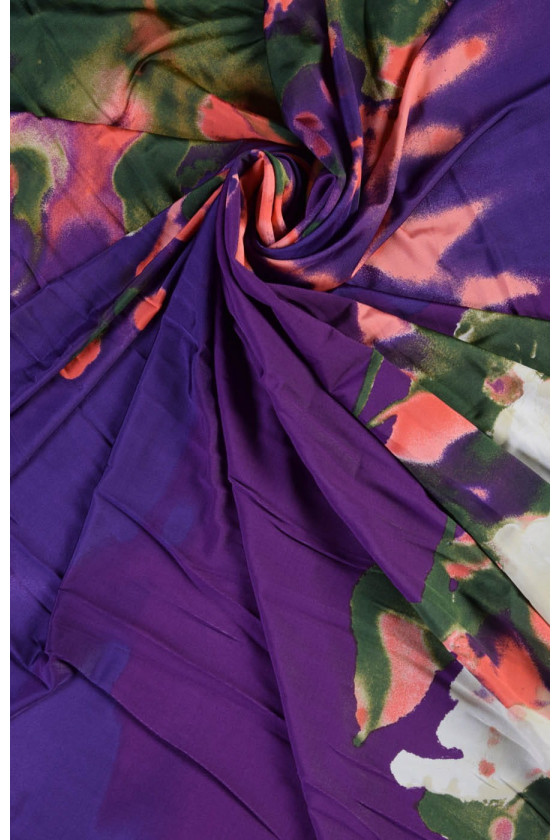 Італійська віскозна трикотажна тканина фіолетового кольору з квітковим мотивом, тканина поставляється в розмірі купонів 115см*140см. Трикотажне полотно слизького - охолоджуючого типу.