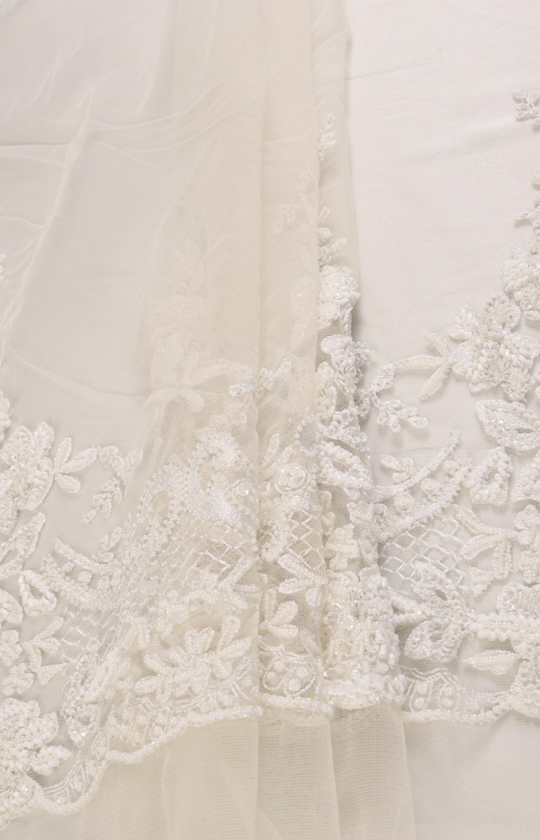 Мереживо екрю, ідеально підходить для обробки весільних нарядів або пошиття корсета, висота викрійки від 12-30 см. Тканина в останньому купоні 60*260см, багато оброблена бісером і перлами.