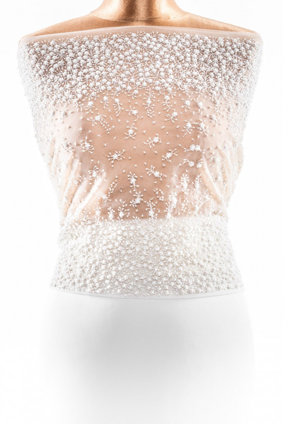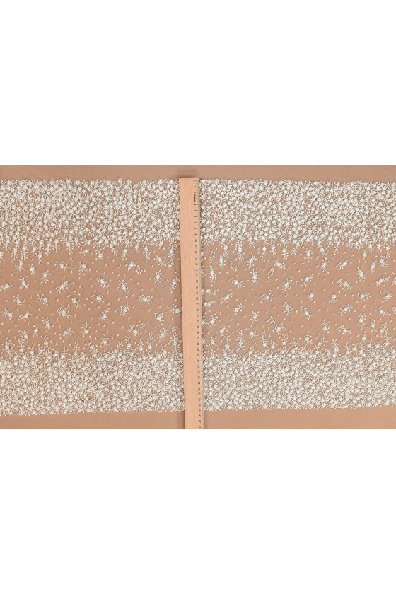 Італійська весільна аплікація у вигляді корсета кремового кольору. Мотив маленьких квіточок з яскравих намистин. Візерунок розріджений посередині і потовщується до країв. Розміри: ширина 110 см, висота 40 см.