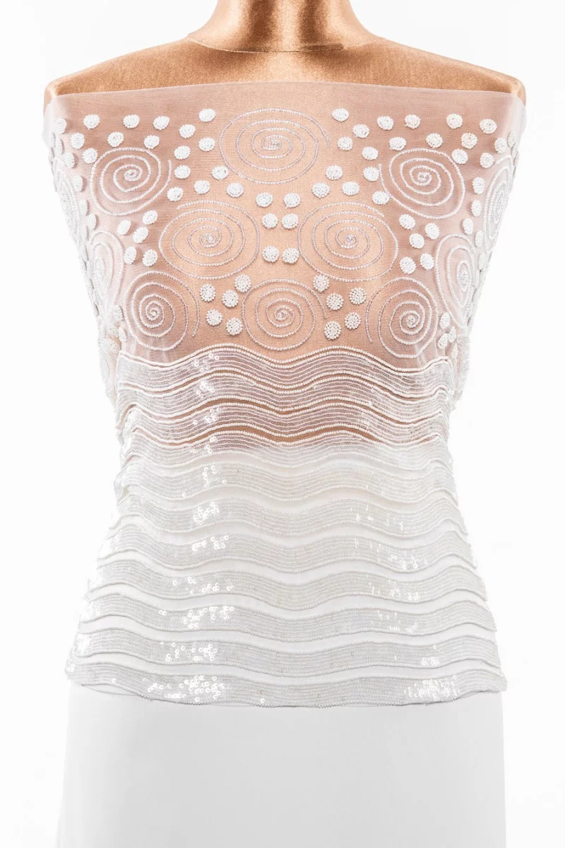 Італійська весільна аплікація у вигляді корсета (блузка - спереду) кремового кольору. Верх аплікації має гарний мотив геометричних візерунків (6 см) з прозорого бісеру, доповнений більш дрібним горошком (1,5 см) перлового кольору, низ - мотивом хвилі (1,8 см), наповненим прозорими паєтками і оточений перламутровим бісером. Все пришито на м'якому фатину. Прекрасна прикраса для весільної або вечірньої сукні.