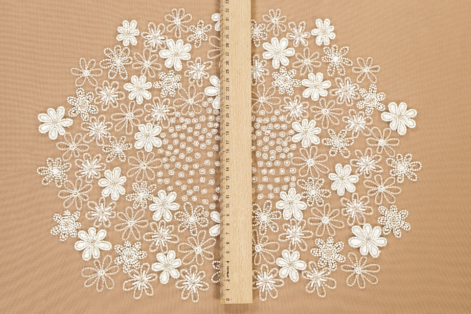 Італійська весільна аплікація кремового кольору. Гарний мотив дрібних квіточок (3 см) з бісеру і перлів, в центральній точці - дрібні геометричні мотиви.