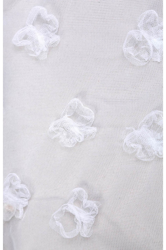 Еластичний фатин, квіти фатину пришиті з двох сторін. Натяжна тканина. На манекені вона приколота по колу. Ідеально підходить для весільних суконь або блуз.