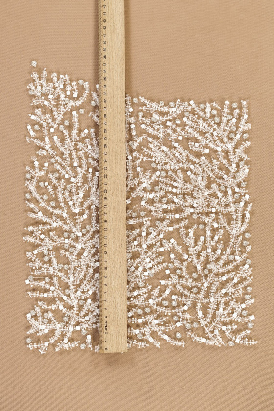 Весільна аплікація в кольорі екрю з молочними каменями і вишивкою люрексом складається з передньої і двох задніх частин. З розмірами окремих елементів можна ознайомитися в таблиці нижче. Комплект, призначений для весільних суконь або корсетів, блуз.