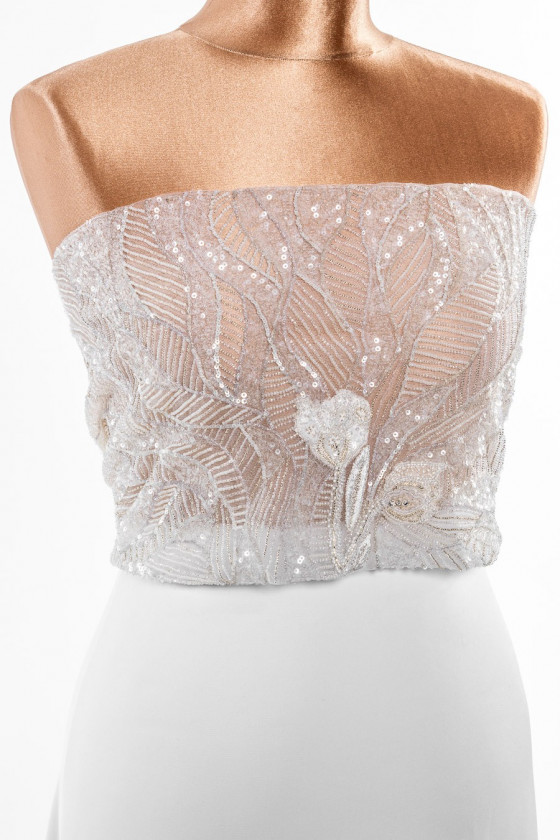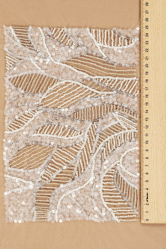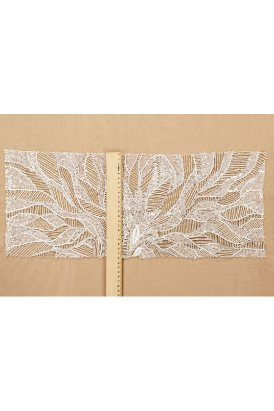 Аплікація корсета складається з трьох частин: передньої і двох задніх частин. Гарний мотив листя густо прикрашений паєтками і бісером.