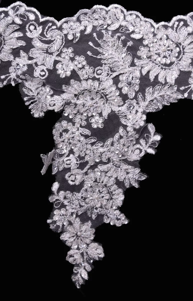 Мереживна стрічка кремового кольору, розшита камінням і паєтками. Тканина оброблена з одного боку зубчиком. Ідеально підходить для обробки весільних суконь.