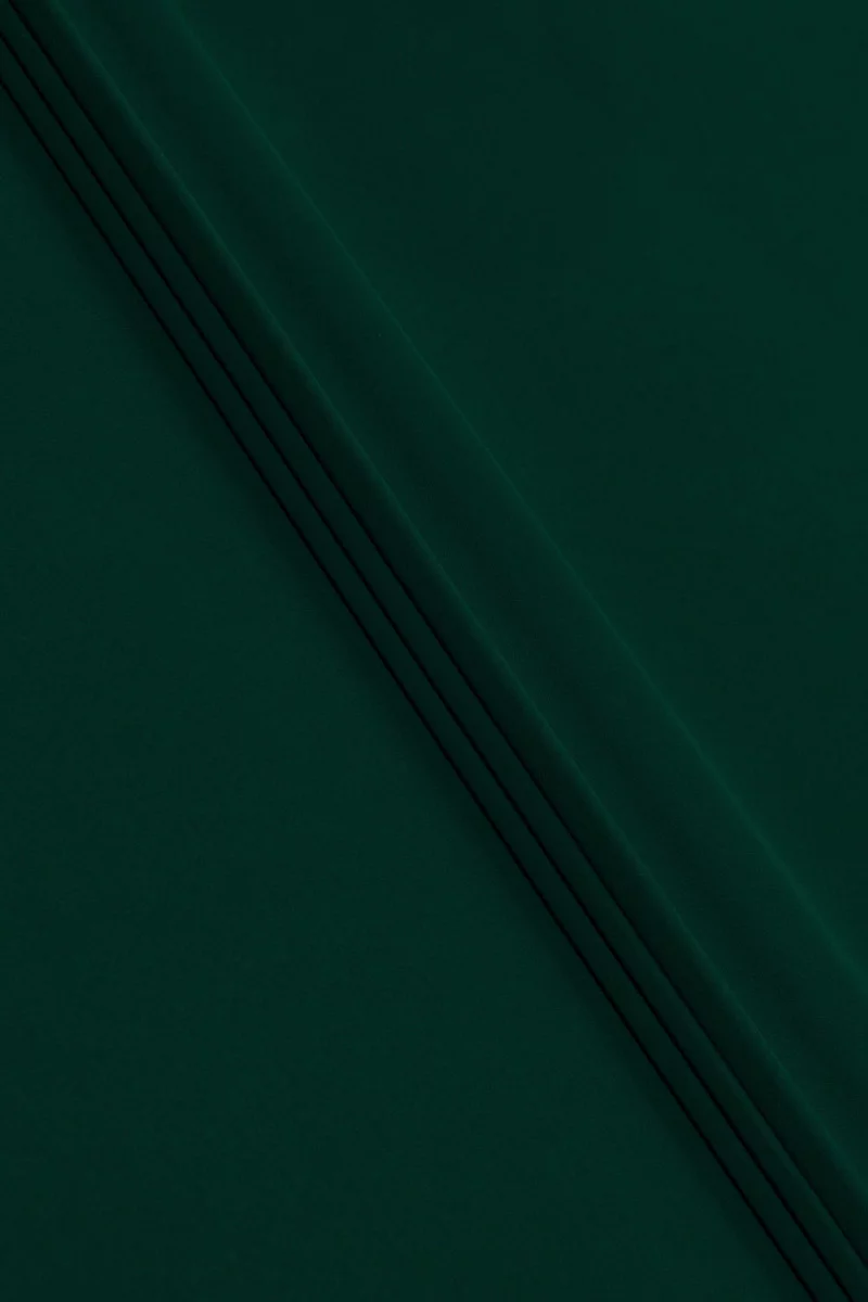 Італійська віскозна тканина каді в двох кольорах - пляшково-зеленому і дуже темному темно-синьому кольорі. Тканина для сукні Cadi непрозора, м'ясиста, струмлива, важка, матова та еластична.