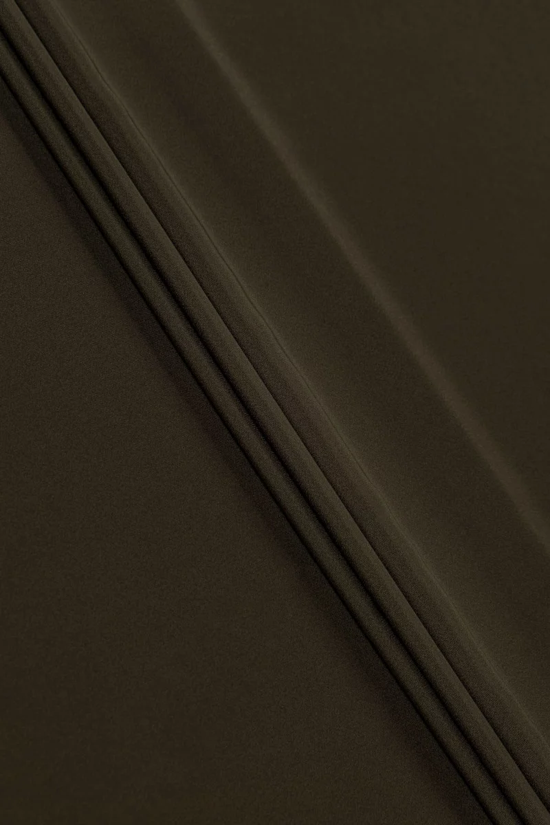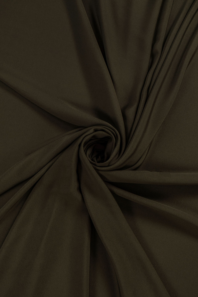 Італійська сукняна тканина каді кольору хакі. Тканина сукні Cadi непрозора, м'ясиста, струмлива (важка) і нееластична. З його допомогою можна шити сукні, блузи, спідниці, штани, костюми.
