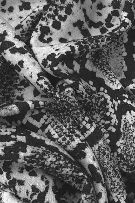Італійська тканина зі 100% віскози з чорно-сірим мотивом зміїної шкіри. Віскоза - тканина, отримана з целюлози, дуже дихаюча і м'яка, вона приємна до шкіри (не викликає алергії) і відмінно вбирає вологу.