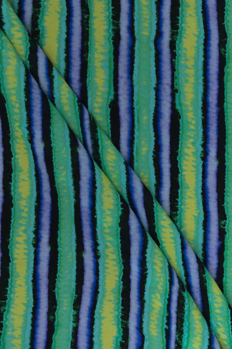 Італійська тканина зі 100% віскози з дуже цікавим мотивом вертикальних візерунків, що нагадують смуги шириною 2 см. Все витримується в зеленому, чорному, фіолетовому і жовтому кольорах. Тканина середньої товщини з щільним переплетенням. Ідеальна пропозиція для людей, які люблять оригінальні візерунки та кольори.