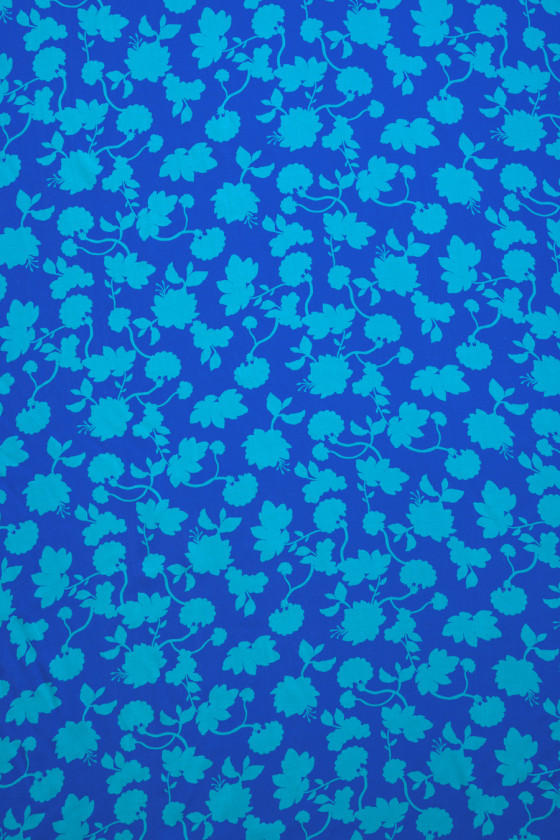 Італійська тканина зі 100% віскози волошкового кольору з щільним мотивом бірюзових квітів. Принт дуже характерний і представлений тільки формами квітів. Тканина нееластична, м'яка і непрозора, дуже приємна на дотик. Цей вид прекрасно підходить для спекотних літніх днів.