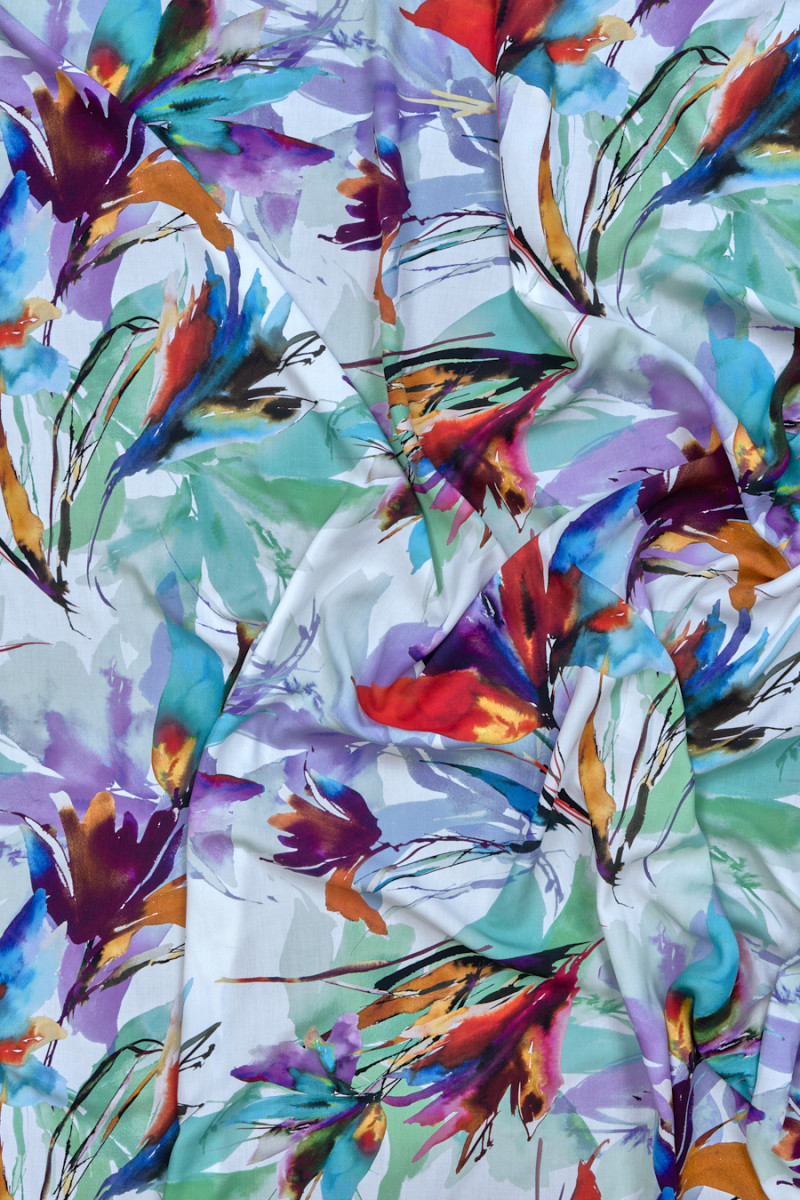 Італійська тканина 100% віскоза з великими, пухнастими квітками зеленого, червоного і фіолетового кольору на білому тлі. Тканина м'яка, струмлива, легка і дуже приємна на дотик. Відмінна пропозиція, з якої можна зшити сорочку, блузку, плаття або спідницю.