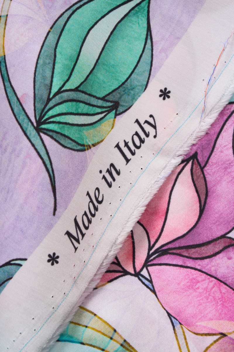 Італійська тканина 100% віскоза з великими, рожевими квітами і світло-зеленим листям на бузковому тлі. Тканина атласна, м'яка, струмлива, легка і дуже приємна на дотик. Ідеальна пропозиція для унікальних нарядів, таких як сукні, спідниці, блузи та сорочки.
