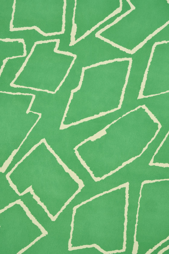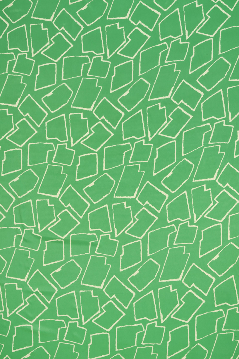 Італійська тканина, виткана з віскози і шовку з геометричними мотивами в кольорі екрю на зеленому тлі. Щільний візерунок, що зображує різні фігури, розташовані близько один до одного. Тканина тонка, але непрозора, легка, нееластична і струмлива. Відмінна тканина, з якої можна шити сукні, блузи, сорочки та спідниці.
