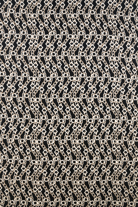Італійська тканина 100% віскоза з мотивом ланцюжка на чорному тлі. Щільний і правильний візерунок, виконаний в кремових і бежевих тонах, одна ланцюжок має ширину близько 2,5 см. Тканина струмлива, м'яка, приємна на дотик, тонка, але непрозора і нееластична. Цікава пропозиція для людей, яким подобаються тканини з характером. Вона прекрасно підходить для пошиття повітряних суконь, спідниць, а також блуз і сорочок.