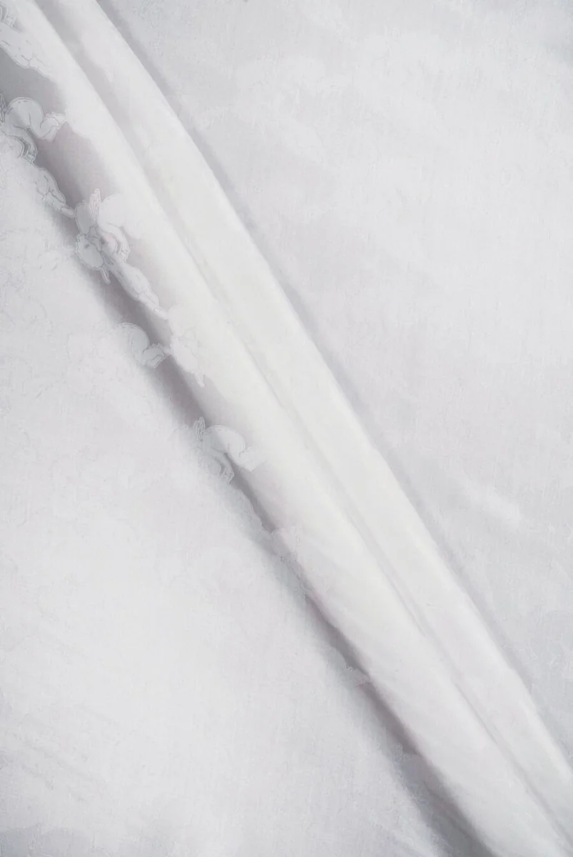 Італійська тканина, виткана зі 100% віскози з ангельським мотивом на кремовому фоні. Жаккардовий візерунок зображує пару ангелів, візерунок правильний і щільний, а розмір одного мотиву становить 5 см*6 см. Тканина виконана з атласного плетіння, вона чудово сяє, а ангели — матові. Матеріал плавний, нееластичний, м'який і приємний у захваті. Романтична пропозиція, яка чудово виглядатиме в пошитті блузки, сорочки, піжами чи шарфа.