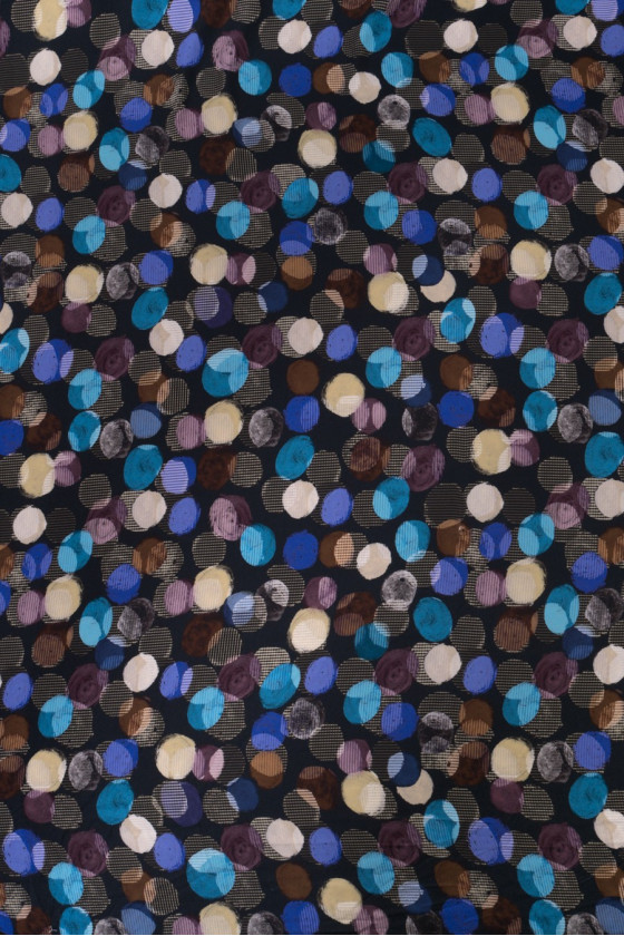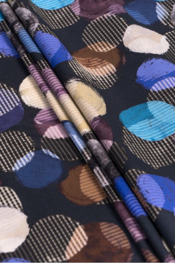 М'ясистий, непрозорий віскозний жоржет з візерунком з великих, різнокольорових кіл.