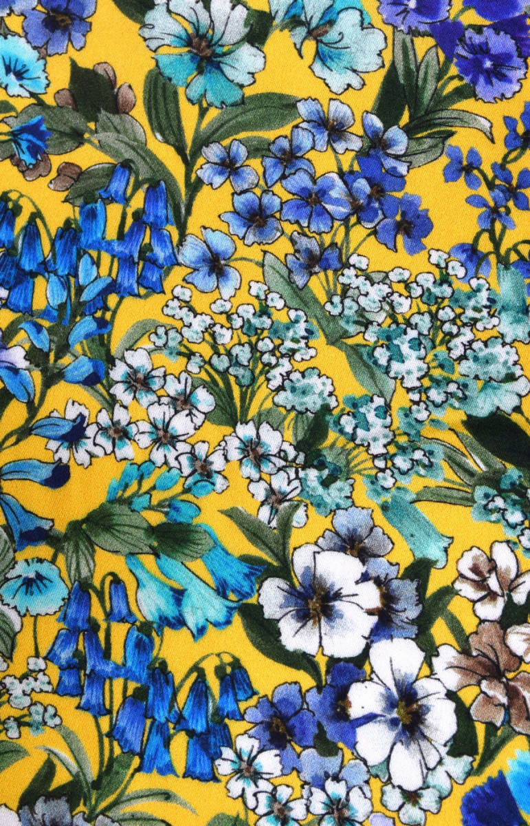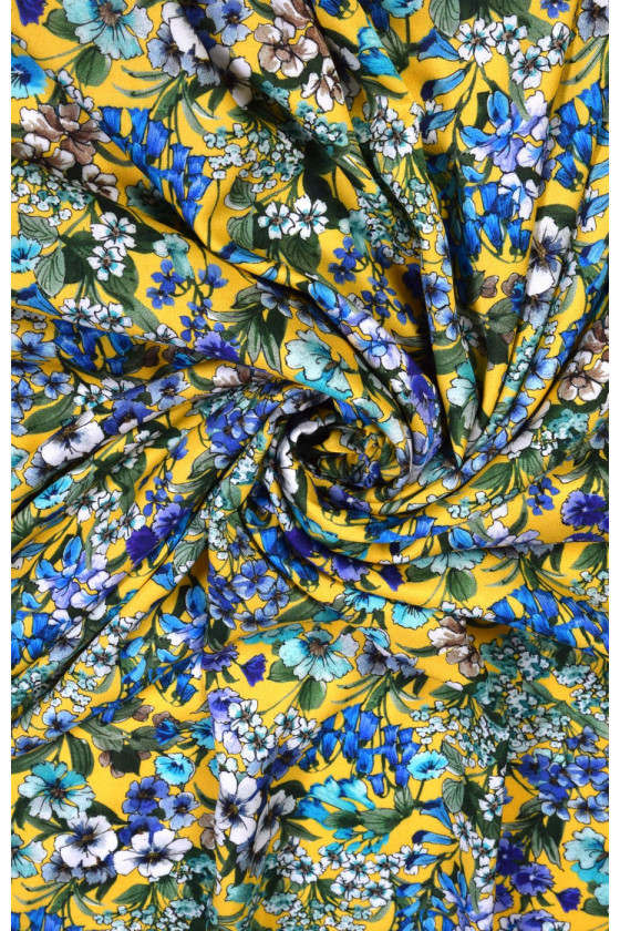 Сукня віскоза з барвистим лугом, м'яка і добре драпірується, середньої товщини. Рекомендуємо шити з нього літні сукні, блузи та спідниці. Вона не прозора, можна пришити її без підкладки. Дуже якісна тканина. Граммаж підходить і для пошиття жіночих сорочок. Ми рекомендуємо провести попередню усадку перед пошиттям, оскільки віскозні тканини можуть мати тенденцію до усадки. Забарвлення: на жовтому тлі - білі, фіолетові, сині квіти.