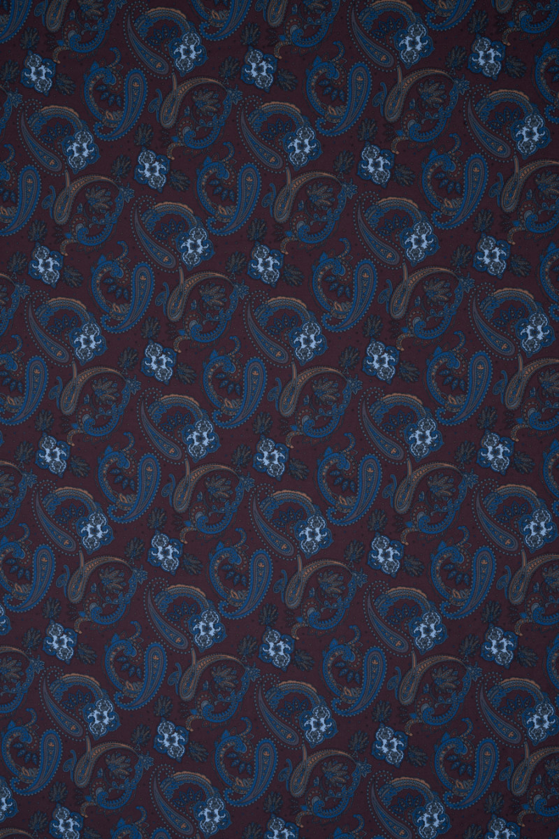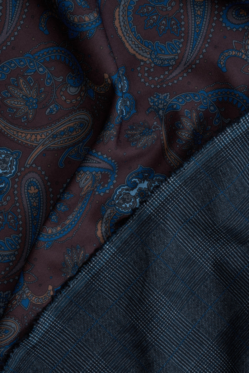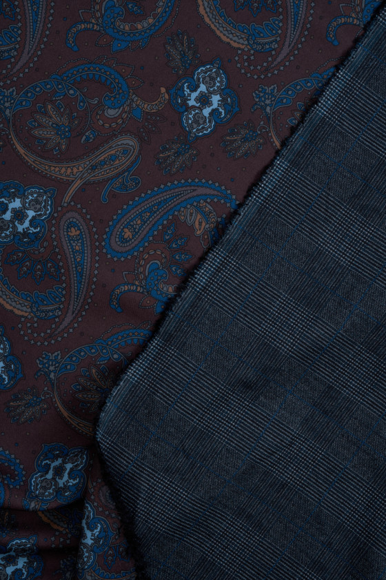 Оригінальне, еластичне двостороннє трикотажне полотно - з одного боку візерунок Паслі в коричневому і темно-синьому кольорах, з іншого - темно-синій і сірий в клітинку.