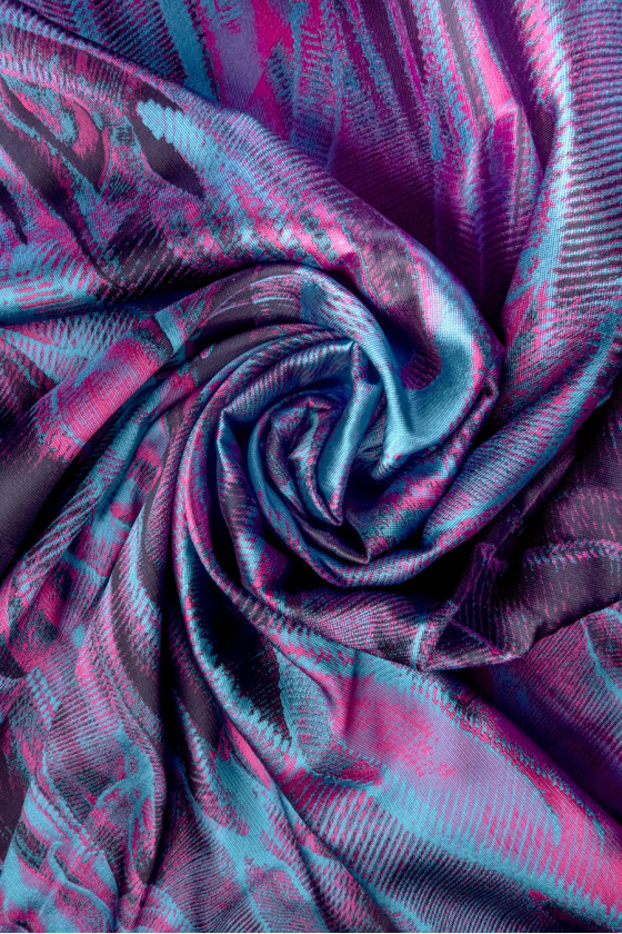 Елегантний жаккард бірюзового кольору з фуксією і чорним, красивий діагональний візерунок, що створює хвильовий мотив, злегка жорсткий. Ідеально підходить для пошиття суконь, спідниць і жакетів. Будь ласка, хімчистка!
