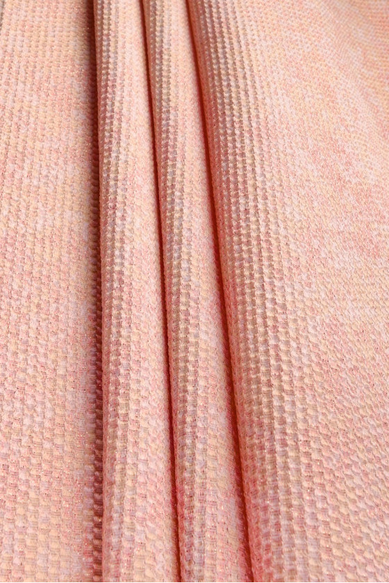 Італійська жакардова костюмна тканина лососево-жовтого кольору. Тканина з тонким рельєфним геометричним малюнком, що нагадує бджолині стільники. Все це прикрашено блискучою золотою ниткою, що надає йому елегантності та вишуканості. Дуже тонка пропозиція для пошиття пальто, костюма або в якості декоративної тканини.