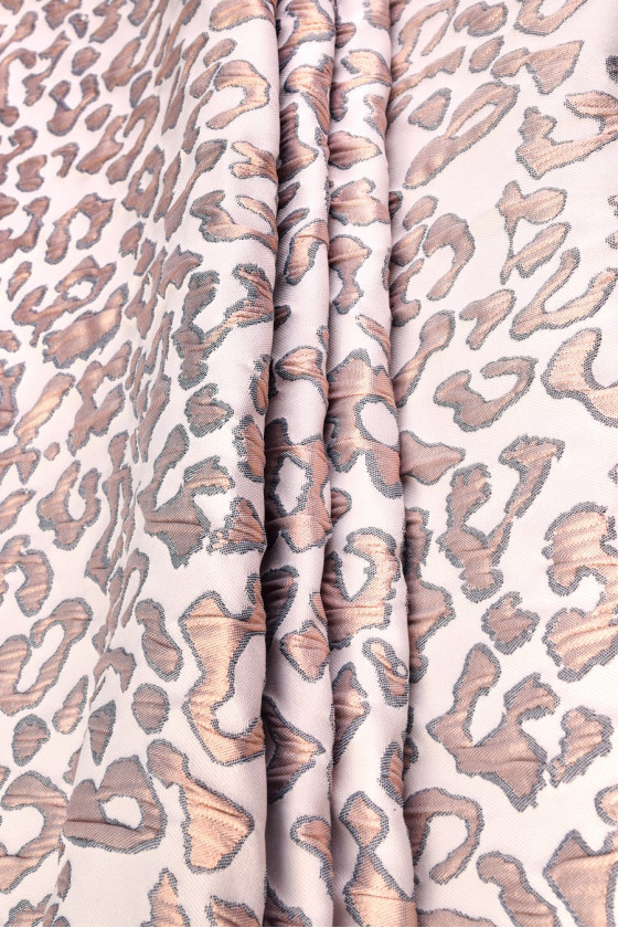 Італійська жакардова костюмна тканина кремово-білого кольору. Матеріал має дуже цікавий малюнок, що нагадує леопардовий принт з розміром близько 4 см. Мотив тварини виготовлений з блискучих ниток мідного кольору і додатково має темно-синю облямівку. Тканина дуже ефектна, має злегка рифлену структуру, що надає їй «пухнастість». Його надзвичайна ковкість і жорсткість роблять його ідеальним для пошиття одягу з конструкцією.