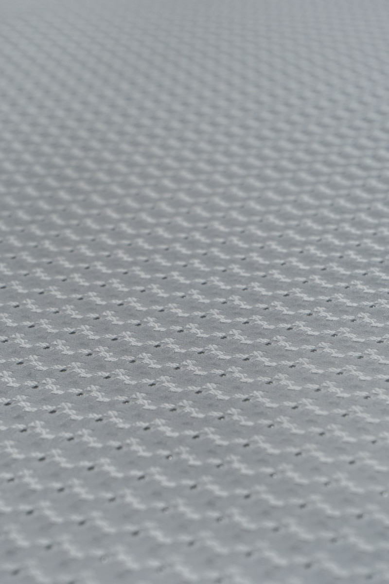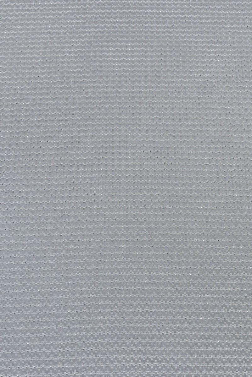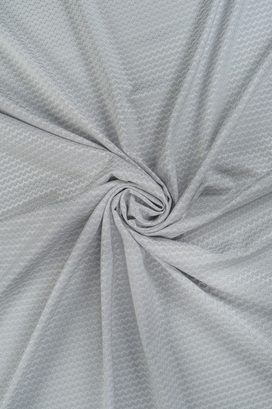 Італійська жакардова костюмна тканина сріблясто-сірого кольору. Дуже цікавий, регулярний візерунок з дрібної клітинки створює горизонтальні смуги шириною 1 см. Крім того, вона прикрашена квадратиками з блискучої срібної нитки. Тканина м'яка і не еластична і злегка жорстка. Він відмінно підійде для пошиття костюма, плаття або ефектного жилета з костюмом.