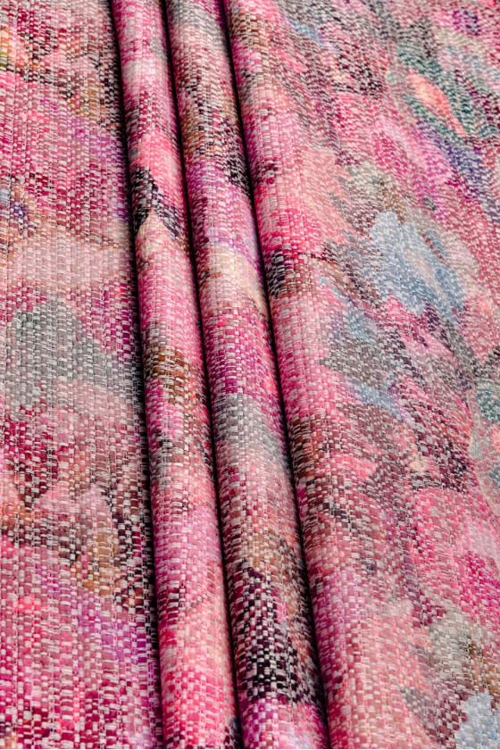 Італійська жакардова костюмна тканина з густим, чітким переплетенням. Дуже ефектний візерунок з великих, пофарбованих квітів. Домінуючими кольорами тут є фуксія і рожевий з елементами синього, зеленого і бордового. Відмінна пропозиція для пошиття елегантного костюма, сукні, спідниці. Тканину також можна використовувати для декору.