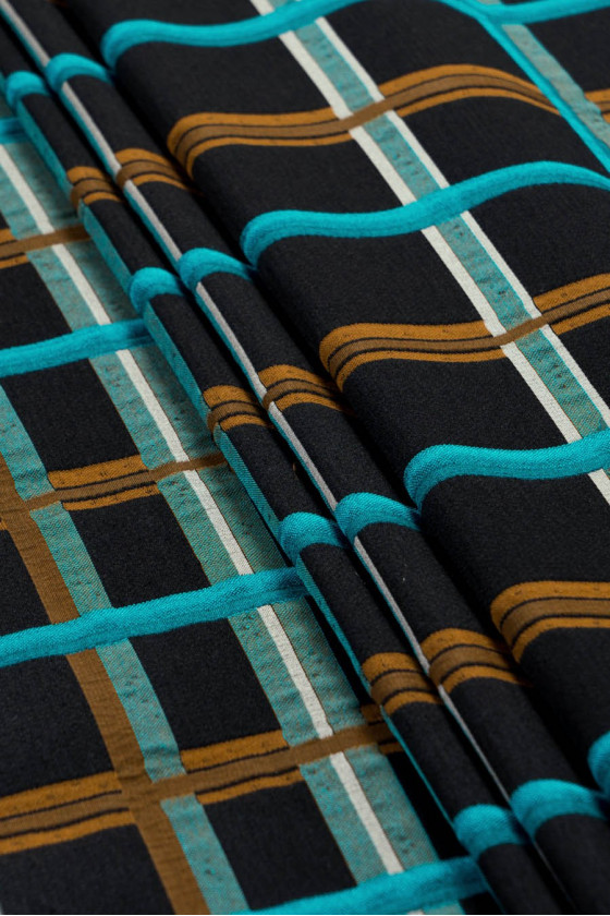 Італійська жакардова костюмна тканина з великою клітинкою (приблизно 9 см). Фон тканини виконаний в чорному кольорі, а малюнок в клітинку - в бірюзовому і медовому кольорах. Бірюзові смужки злегка блискучі, а медові - матові. Чорна начинка має злегка шорстку структуру. Матеріал нееластичний і злегка жорсткий - відмінно підійде для пошиття костюма або пальто і в якості декоративної тканини.