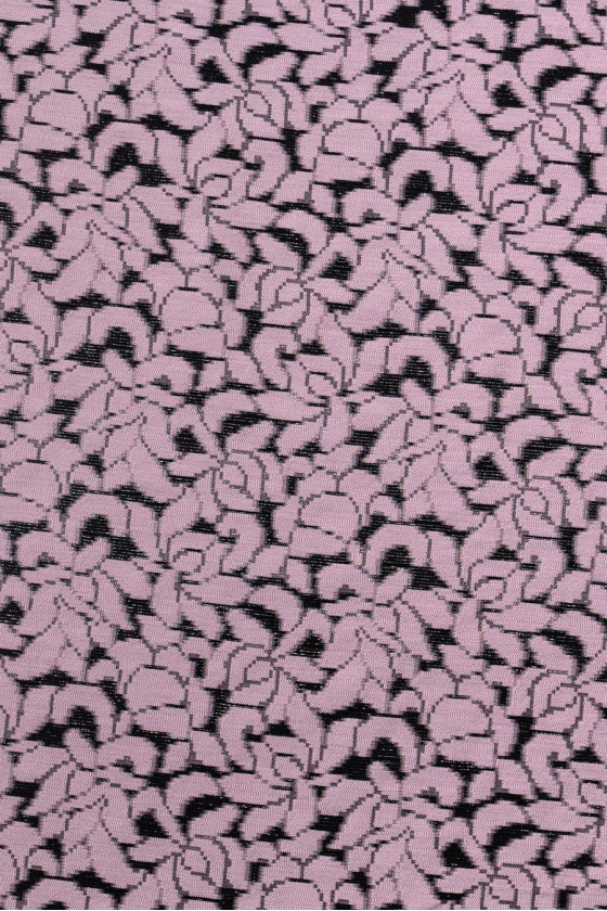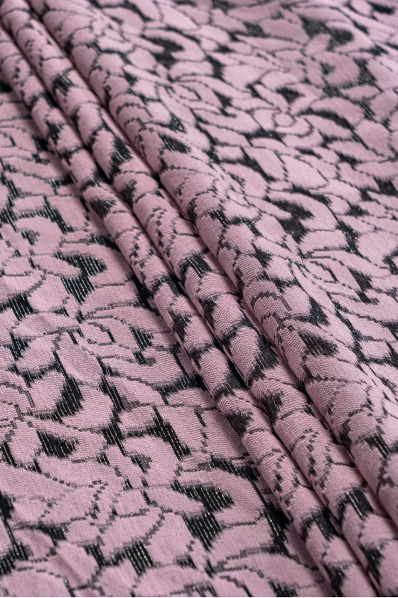 Італійська жакардова костюмна тканина, виткана в техніці девор. Це поєднання гладкої, прозорої органзи з натурального шовку чорного кольору з непрозорим квітковим мотивом брудно-рожевого кольору. Крім того, вся тканина має вплетену в неї сріблясту, блискучу нитку. Матеріал тонкий і трохи жорсткий, і в той же час злегка блищить. Дуже оригінальна пропозиція для пошиття сукні або спідниці.