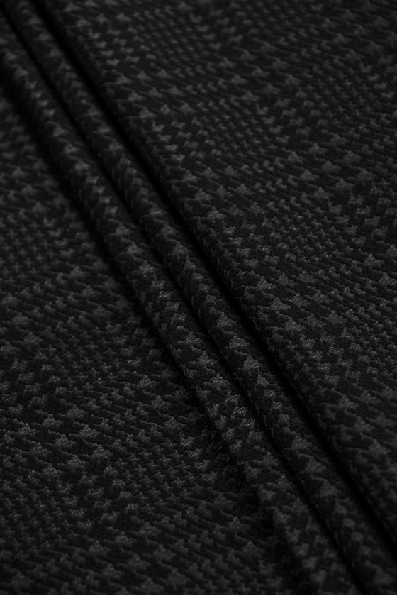 Італійська костюмна тканина графітового та чорного кольорів з мотивом курячої лапки, який утворює клітинку (близько 3 см). Малюнок матовий, а фон злегка блискучий.