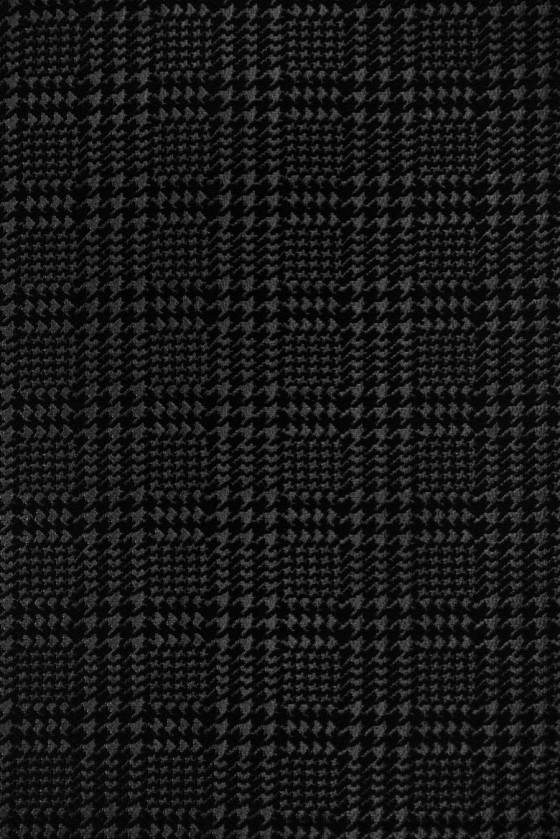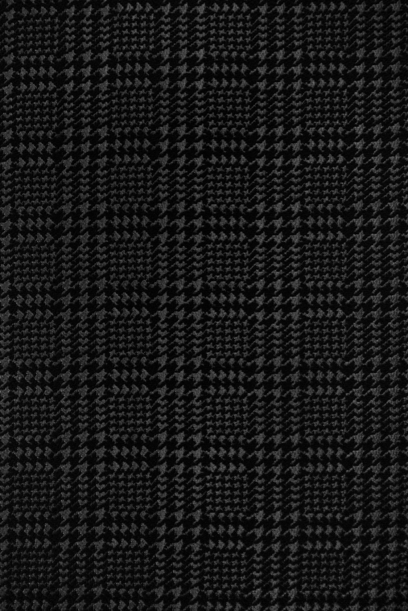 Італійська костюмна тканина графітового та чорного кольорів з мотивом курячої лапки, який утворює клітинку (близько 3 см). Фон тканини матовий і виконаний з поліестеру, в той час як малюнок вишивається чорними, матовими вовняними нитками і злегка опуклий. Більш щільна тканина ідеально підходить для пошиття костюма, жакета, спідниці, плаття, тонкого пальто або куртки.
