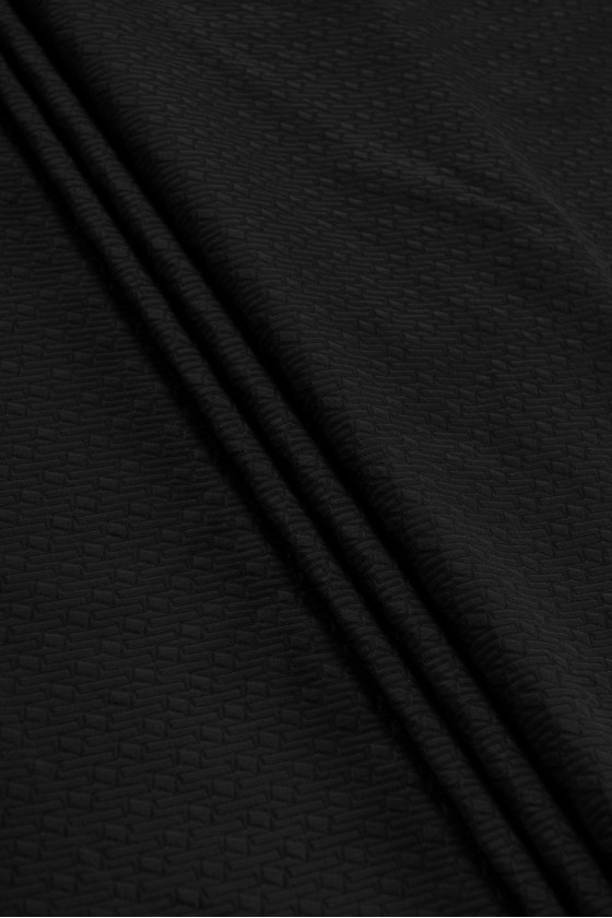 Чорний жаккард, на якому вишиті дрібні геометричні візерунки (квадрати, прямокутники). Візерунок щільний, правильний, створює цікаве ціле. Тканина середньої товщини, напівматова, не еластична і злегка жорстка за розміром. Ми рекомендуємо його для пошиття спідниць, жакетів, жакетів, тонких пальто.