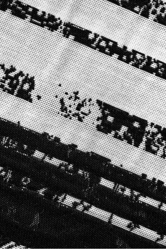 Італійська жакардова костюмна тканина білого і чорного кольорів. Дуже цікавий мотив з горизонтальних смуг, який повторюється через кожні 15см. Смуги доступні в білому, білому та чорно-чорному кольорах. Чорні смуги виконані з блискучої тканини і злегка опуклі. Тканина тонка, не еластична, злегка жорстка. Вона відмінно підійде для пошиття широкої спідниці або плаття, а також в якості декоративної тканини.