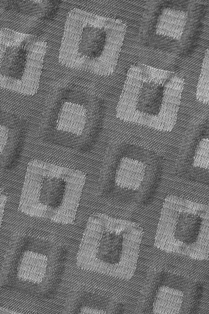 Сірий жаккард, сплетений у дрібний геометричний візерунок з більш легких квадратів. Спосіб плетіння створює гофрування тканини, що дає 3D-ефект.