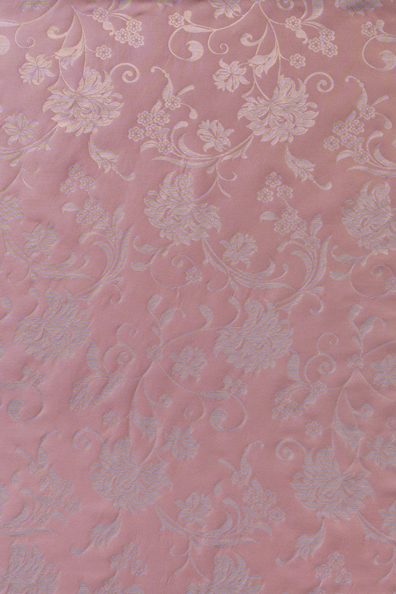 Італійська жакардова костюмна тканина з квітковим мотивом. Фон виконаний в світло-рожевому кольорі, а мотив квітів і листя в кольорі екрю, додатково прикрашений блискучою ниткою в кольорі рожевого золота. Тканина, навпаки, має протилежний колір - її можна пришивати з двох сторін. Тканина злегка жорстка, фон матовий, а малюнок злегка блискучий, що надає йому тонкої елегантності. Вона відмінно підійде для пошиття суконь і костюмів для сімейних торжеств, а також в якості декоративної тканини