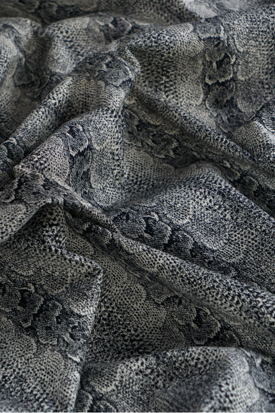 Італійська жакардова костюмна тканина з мотивом зміїної шкіри чорного кольору та екрю. Еластична, злегка жорстка тканина - відмінно підійде для пошиття сукні, брюк, спідниці, костюма. Склад: віскоза, еластан