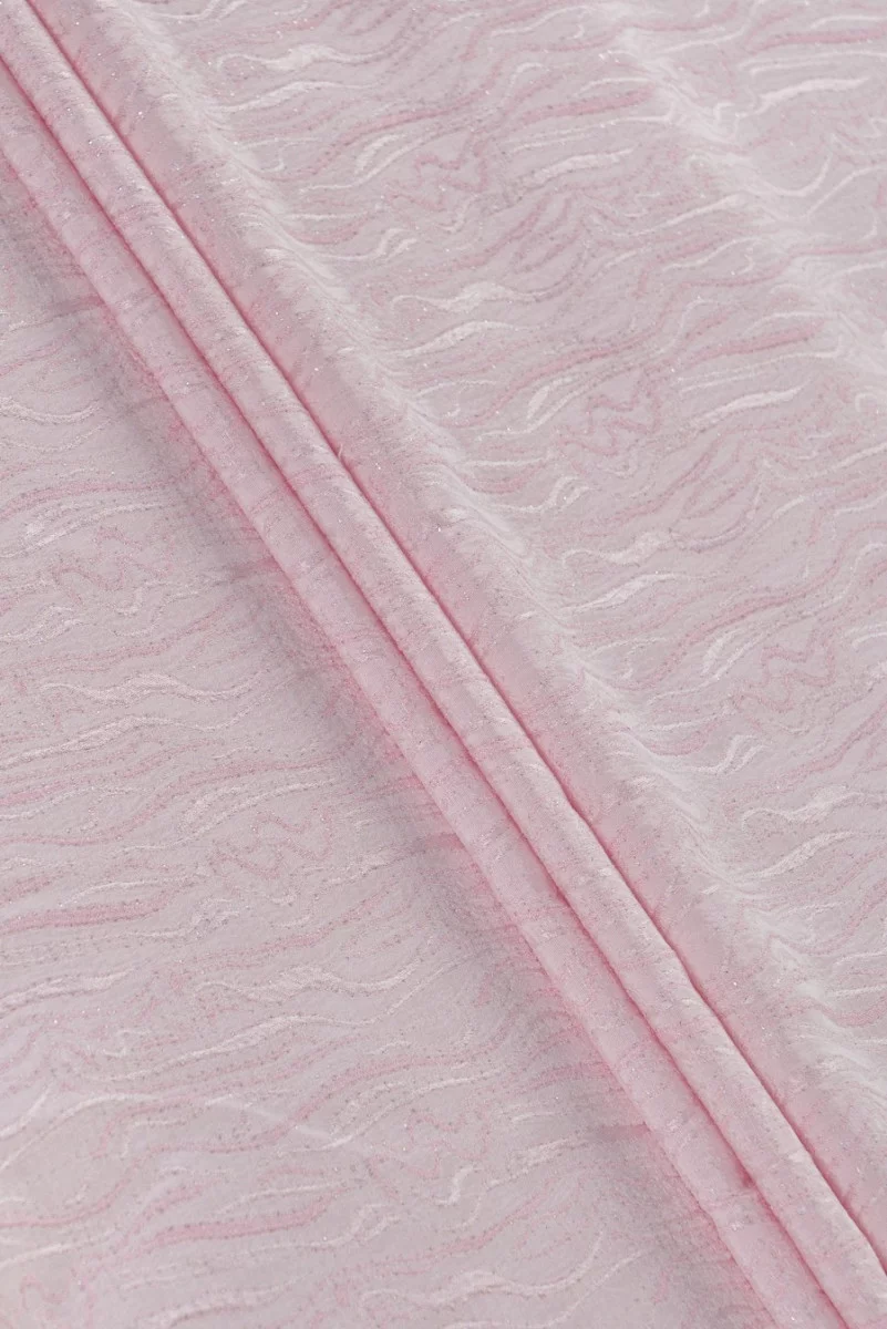 Італійська жакардова костюмна тканина з мотивом, що нагадує хвилі. Фон тканини світло-рожевий, при цьому візерунок виконаний з ниток більш світлого відтінку, ніж фон і більш темного. Крім того, все прикрашено прошивкою з блискучих срібних ниток. Це робить тканину більш елегантною і тонко блискучою. Тканина досить тонка, не еластична, злегка жорстка - відмінно підійде для пошиття сукні, спідниці, костюма для сімейних торжеств.