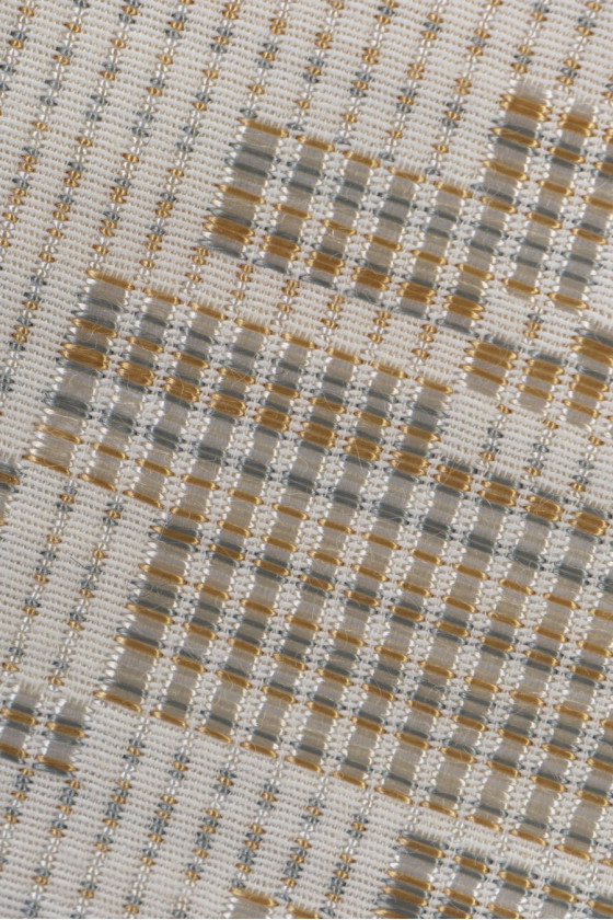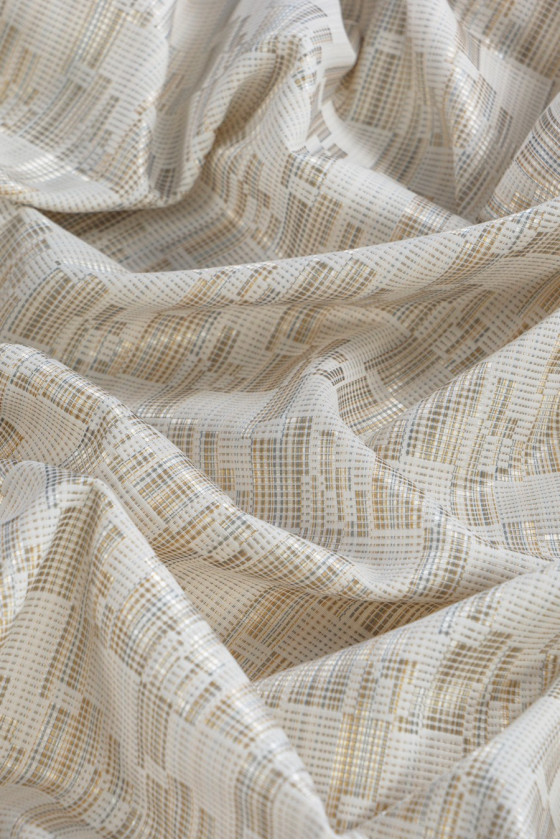 Італійська жакардова костюмна тканина з мотивом курячої лапки. Фон з тканини виконаний в кольорі з малюнком з бежевих і сірих ниток. Тканина м'яка, тонша з ніжним блиском - відмінно підійде для пошиття костюма, спідниці, сукні, пальто.